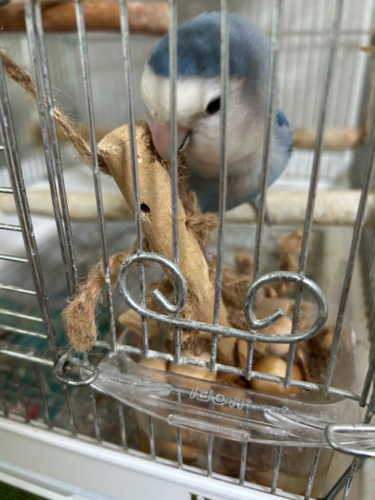 1日の大半をゲージで過ごすインコにとって、おもちゃは運動不足抑制とストレス発散のために必要になります。特にラブバートは毛引きしやすいため、気を紛らわせるためにもおもちゃはあったほうがいいです。カラフルな色を見たり、鈴の音を聞いたり、おもちゃを動かして遊ぶことで脳内が活性化するとも言われています。一方でラブバートは1つのおもちゃに執着して発情してしまうこともあるため定期的にレイアウト変更やおもちゃの入れ替えが必要です。