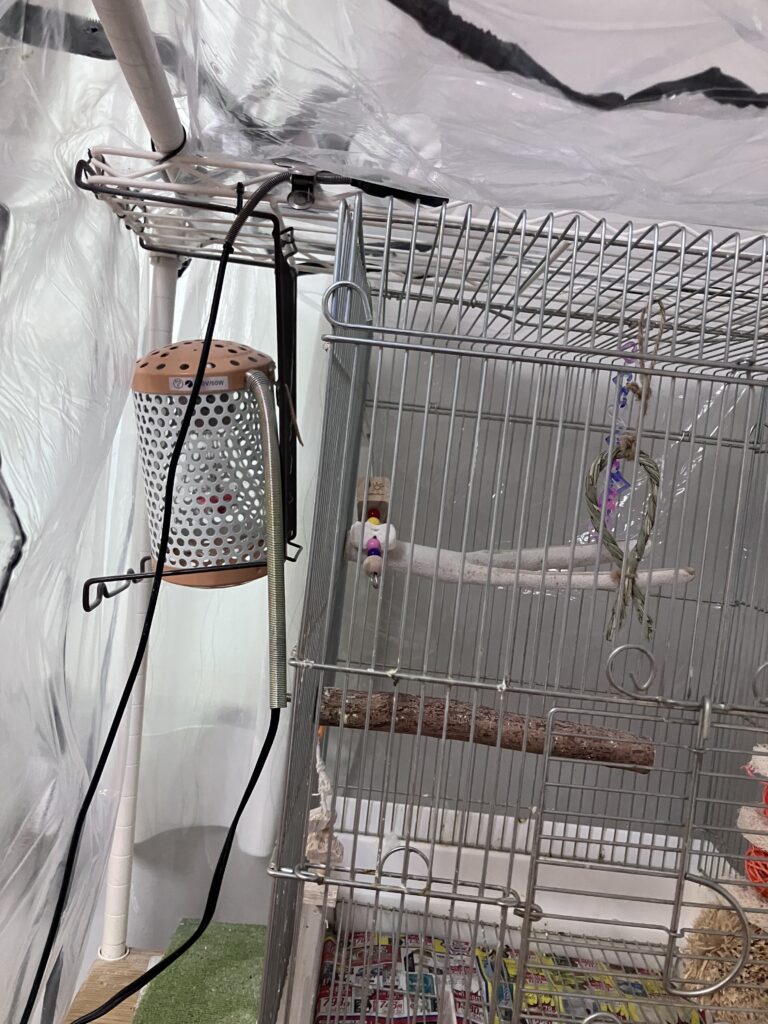 このように、百均で買ってきたワイヤーバスケットを結束バンドを使い固定しています。これを使えば保温電球が直接インコに触れることがないためコード噛みや火傷の心配はありません。
